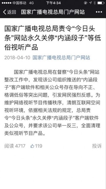 4月10日消息,据国家广播电视总局官方微信公众号消息,国家广播电视总局在督察“今日头条”网站整改工作中,发现该公司组织推送的“内涵段子”客户端软件和相关公众号存在导向不正、格调低俗等突出问题,引发网民强烈反感。为维护网络视听节目传播秩序,清朗互联网空间视听环境,依据相关法规的规定,总局责令“今日头条”永久关停“内涵段子”客户端软件及公众号,并要求该公司举一反三,全面清理类似视听节目产品。