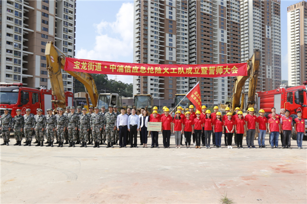 【香港商报网讯】记者朱开芝、通讯员周维朕报道:“我志愿加入应急抢险义工队,践行无私奉献的志愿精神,以保护人民群众生命财产安全为职责使命,帮助他人,服务社会……”2018年4月10日上午,在深圳市龙岗区举行的“宝龙街道·中浦信应急抢险义工队成立暨誓师大会”上,近百名身穿红色义工服的义工队员作出了庄严的宣誓。誓师大会上,宝龙街道领导向义工队进行了授牌和授旗。据悉,这支新成立的义工队是深圳市首支以应急抢险救援为主,拥有近百台大型抢险救援机械设备和车辆的义工队。