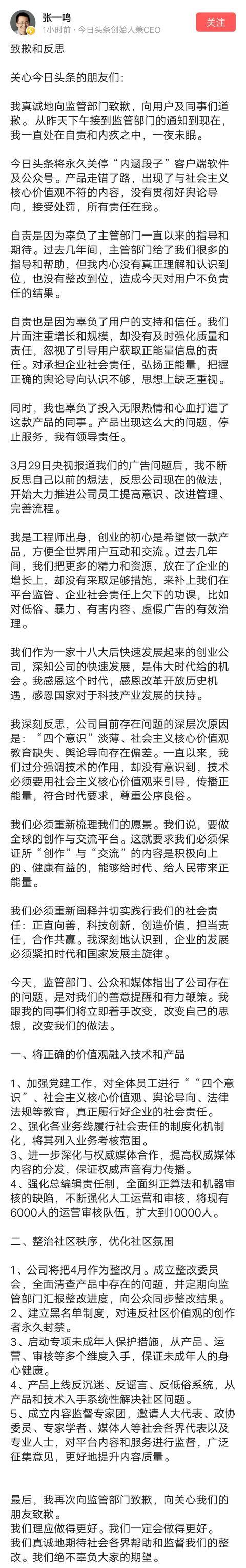张一鸣在公开信中称,今日头条将永久关停“内涵段子”客户端软件及公众号。产品走错了路,出现了与社会主义核心价值观不符的内容,没有贯彻好舆论导向,接受处罚,所有责任在我。致歉信还详细列举了一些具体整改措施。例如,将正确的价值观融入技术和产品,强化总编辑责任制,全面纠正算法和机器审核的缺陷,不断强化人工运营和审核,将现有6000人的运营审核队伍,扩大到10000人。