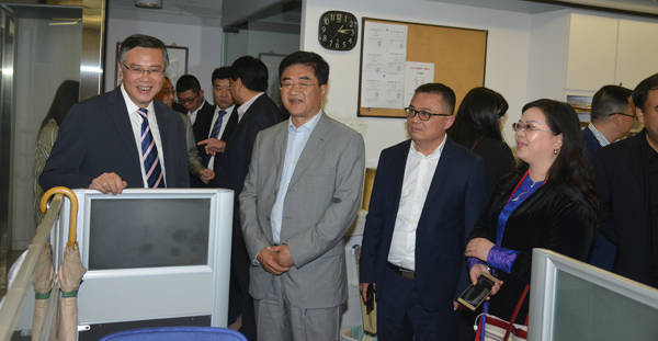 貴州省委常委、宣傳部長慕德貴(左二)一行訪問香港商報,圖為本報社長陳寅陪同嘉賓參觀編輯部。右二為貴州省委宣傳部副部長、省政府新聞辦主任哈思挺。