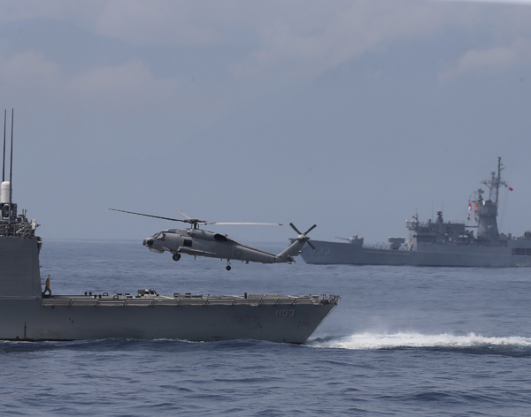 鄭和艦艦載的S-70C反潜直升機起飛,前往龜山島附近海域評估戰果。中央社