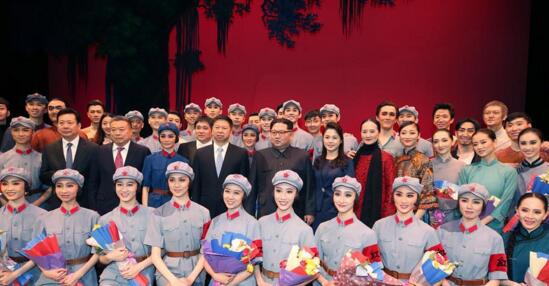 演出结束时,在全场观众的热烈掌声中,金正恩和李雪主上台同演职人员握手,对艺术家们的出色表现给予高度评价,并与大家合影留念。