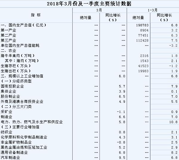 初步核算,一季度国内生产总值198783亿元,按可比价格计算,同比增长6.8%。分产业看,第一产业增加值8904亿元,同比增长3.2%;第二产业增加值77451亿元,增长6.3%;第三产业增加值112428亿元,增长7.5%。