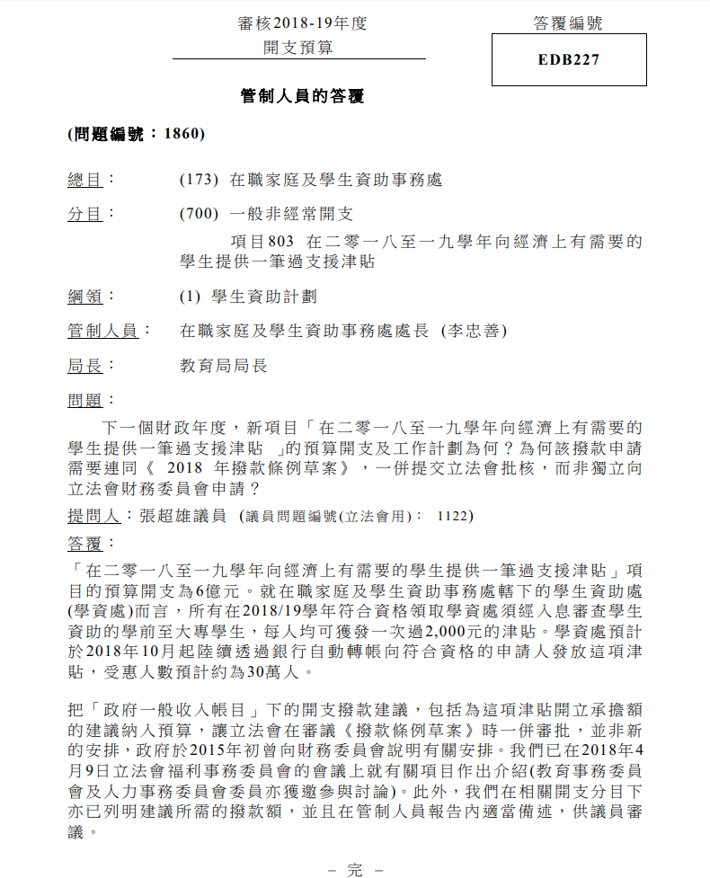 教育局今日於立法會特別財委會回應議員提問時指,所有在2018/19學年,申請在職家庭及學生資助事務處轄下「學生資助處」,各項須經入息審查學生資助,並被評定為符合資格領取其中一項資助的學前至大專學生,每人均可一次過自動獲發2,000元的津貼。符合資格的學生毋須就有關津貼另行向學資處遞交申請。