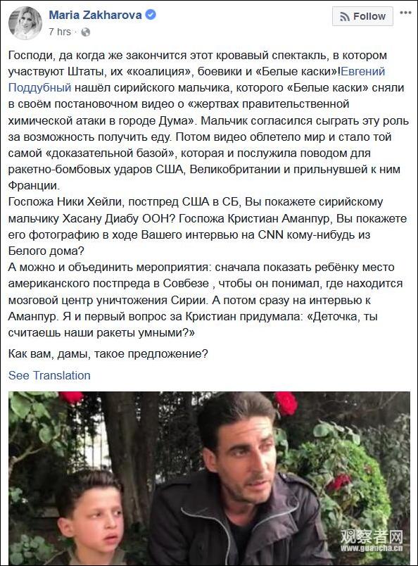这则新闻播出后,俄罗斯外交部发言人扎哈洛娃在社交媒体上回应,对美英法发出嘲讽:“这就是你们轰炸叙利亚的证据?”