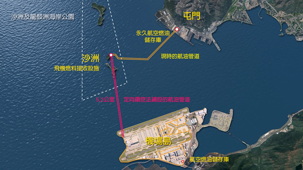 目前航空燃油供應系統是由位於屯門永久航空燃油儲存庫,經沙洲的海底管道至機場停機坪,舊管道藏於海底10米,但由於現時正進行第三跑道的填海工程,部分位置與填海工程重疊,機管局擔心現時的海底管道無法承受新跑道填海工程的壓力,故需要重新鋪設。