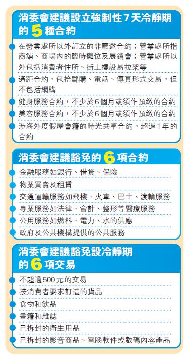 報告建議下列消費交易設立強制性冷靜期,包括在營業處所以外訂立的非應邀合約、遙距合約(網購除外)、健身服務合約、美容服務合約、時光共享合約。報告建議冷靜期時限不少於7天,由消費者收到貨品、就服務交易之日起計算。