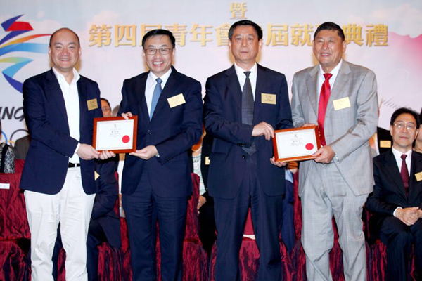 何靖(左二)、高志立(右二)頒發委任狀給侯慶虎(右一)、彭一庭(左一)。