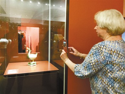 俄罗斯文化政治杂志《消息》总编辑纳塔利亚·维克多罗夫娜在每个藏品前都驻足良久。她告诉记者,虽然她此前到过中国,但很遗憾没有去过中国的博物馆。这次很高兴能在家门口看到中国主题的展览,「中国的展品每一件都不简单,每一条纹饰、每一处色彩都有自己的象征意义,值得细细欣赏。」