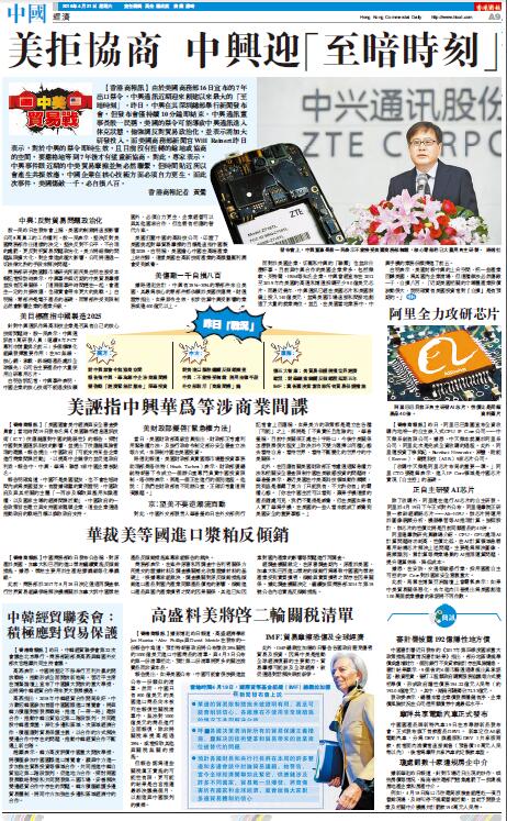 【香港商報网訊】記者黃鶯报道:由於美國商務部16日宣布的7年出口禁令,中興通訊近期迎來創建以來最大的「至暗時刻」。昨日,中興在其深圳總部舉行新聞發布會,但發布會僅持續10分鐘即結束。中興通訊董事長殷一民稱,美國的禁令可能導致中興通訊進入休克狀態,他強調反對貿易政治化,並表示將加大研發投入。而美國商務部新聞官Will Reinert昨日表示,對於中興的禁令即時生效,且目前沒有扭轉的餘地或協商的空間,要嚴格地等到7年後才有望重新協商。對此,專家表示,中興事件跟近期的中美貿易摩擦並無必然聯繫,但時間貼近所以會產生共振效應,中國企業在核心技術方面必須自力更生,而此次事件,美國傷敵一千,必自損八百。