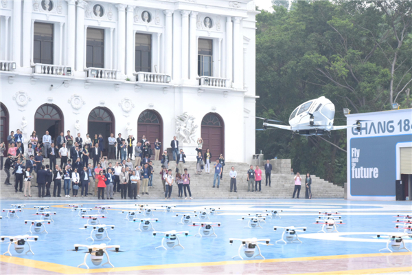是次,本港議員聯席訪問團遠道而來,億航公司當然畀足面,為團員們展示了精彩的飛行表演。議員們都興致勃勃,紛紛舉起相機、手機拍照;表演一結束,眾人更爭相進入無人機拍照。