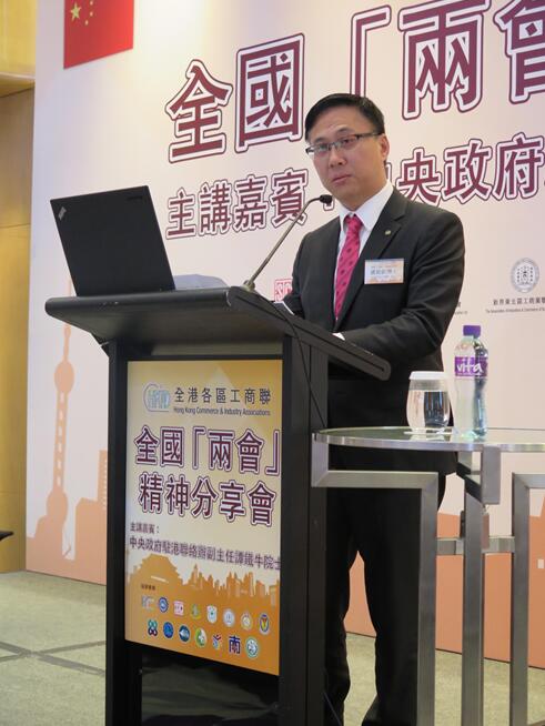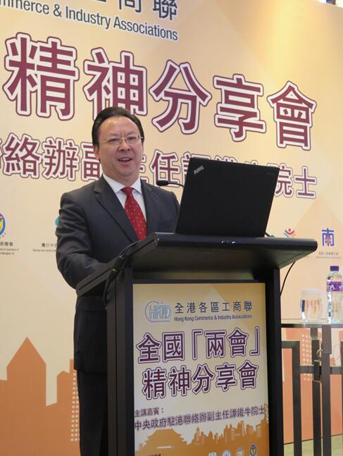 譚鐵牛在座談會上,為商界圖文并茂地準備簡報投影,深入淺出地為商界解釋兩會精神要點。在現場交流答問環節,他指出,全國兩會作出的許多重大決策部署都與香港的發展息息相關,為「一國兩制」實踐行穩致遠提供了更加堅實的制度保障,為香港融入國家發展大局、保持長期繁榮穩定提供了更加強勁的發展動力,為廣大香港同胞特別是青年朋友把握國家發展機遇、共用祖國繁榮富強的偉大榮光創造了更好條件,提供了更加廣闊的奮斗空間。他續說將本着資源分享、合作雙贏,認真學習借鑒成功經驗,切實加強交流合作,也希望各位商界朋友能抓住發展機遇,攜手共進,再創輝煌。