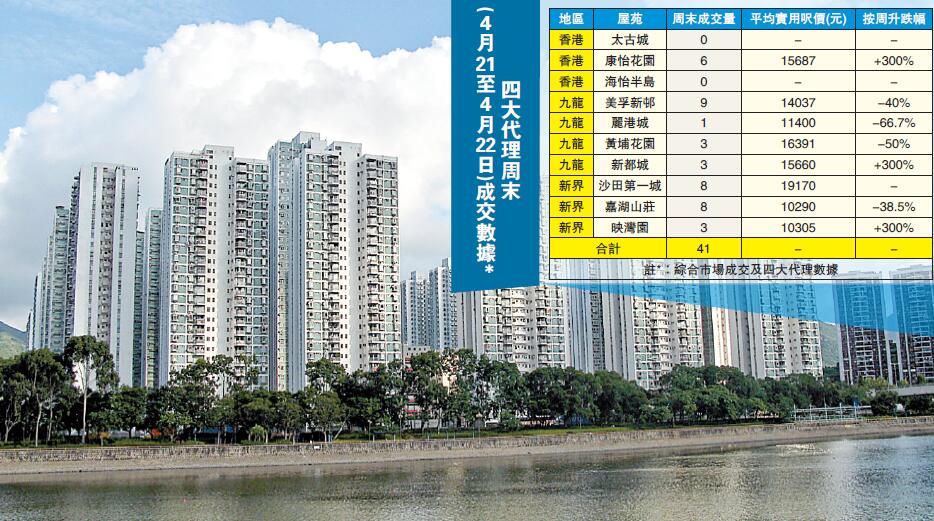若以屋苑劃分,根據綜合四大代理的數據,「美孚新」表現最佳,錄得9宗成交;其次才是「沙田第一城」及「嘉湖山莊」各錄得8宗成交;「康怡花園」則錄6宗;至於「黃埔花園」、「新都城」和「映灣園」分庭抗禮,均錄得3宗成交;九龍盤「麗港城」亦有1宗成交;而「太古城」及「海怡半島」則上周食白果,沒有錄得成交。