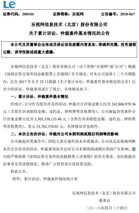 腾讯财经讯 4月25日消息,乐视网(sz300104)公告,经统计,公司作为原告涉及的诉讼、仲裁合计涉案金额人民币2.44亿元(含原告诉求赔偿金额、违约金、律师费等其他费用);公司被起诉类案件合计涉案金额人民币33.05亿元(含原告诉求赔偿金额、违约金、律师费等其他费用)、美元5376.24万元。公司被起诉类案件中,因较大部分案件尚未审理裁决,公司尚无法准确判断本次公告涉及的诉讼、仲裁事项是否会对公司本期利润或期后利润产生影响。