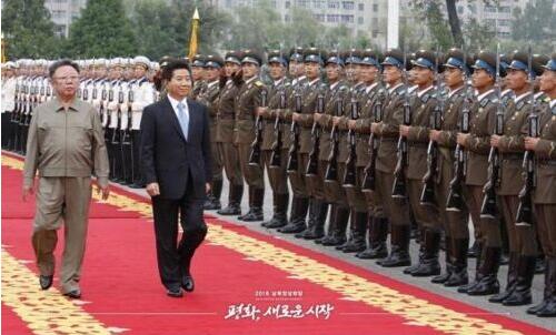 资料图:2007年韩朝首脑会谈举行,时任韩国总统卢武铉(右)与朝鲜国防委员长金正日检阅朝军仪仗队。