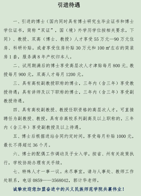 “首先坦白,学校很一般很一般:一、不是数字序列高校(985-211)…... 二、交通情况暂时不“高速”……三、人才引进政策待遇一般……以上情况可以接受的话,您再看看以下内容,也许可以考虑过来学校看看谈谈……搜肠刮肚再说一个,兴义市是世界级春城之一(数据来源百度)……还有啥?噢对了,牛肉便宜35元一斤现宰现杀不注水。”
