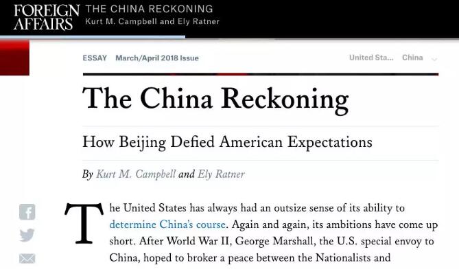 今年2月份,美国前国务院亚太事务助理国务卿坎贝尔与前副总统拜登的副国家安全顾问雷特纳,在美国《外交事务》发表了一篇名为《中国重估算:北京是怎样让美国期望落空的》的文章。文章虽然不似特朗普政府的《国安战略报告》般“咄咄逼人”,但其行文,同样以美国视角审视中国的发展道路,并对此表达出“失望”。阅读此文,也能看出目前美国对华战略的深层逻辑。