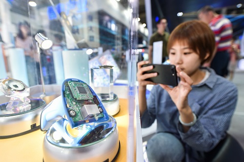 2018年4月23日,在首届数字中国建设成果展览会上,观众在拍摄数字公民安全解码芯片。 新华社记者宋为伟摄
