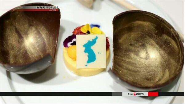 日本政府相关人士称,晚餐甜点所配的板状巧克力上描绘了象征韩朝“统一”的朝鲜半岛,其中也包含独岛。