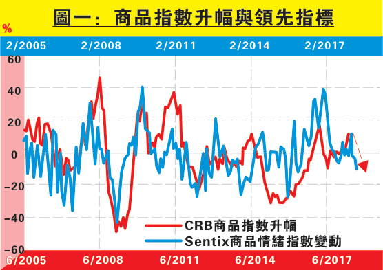 參考市場預期,以Sentix商品情緒指數變動為例,該指標反映受訪者對商品價格中期走勢的預期,因此圖一顯示其與CRB商品指數升幅整體一致。從兩組數據的相關係數可見,Sentix商品情緒指數變動領先CRB商品指數升幅約四個月。此外,指標顯示市場預計商品價格升幅在中期將見放緩甚至萎縮,若按紅箭預示,估計CRB商品指數升幅將在未來四個月同樣見放緩。