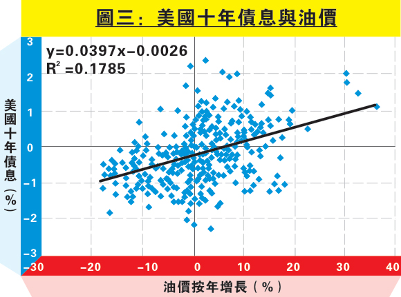 在這前提下,再看油價與十年債息關係。由於長息反映市場對通脹前景的看法,而通脹主要受油價升幅影響,因此油價與長息應同向。如圖三顯示,油價按年增長與美國十年債息呈正比關係;以回歸分析結果p值接近零可見因果關係成立。若套上圖二得出油價變幅在四個月後將見近一成跌幅於圖三算式上,得出美國十年債息短線按年變動應只見0.35厘回落,即十年孳息四個月後最低處於2.6厘左右,要見長期處於3厘以上有難度。值得留意的是其實3厘只是心理關口,並非技術阻力;筆者料若十年孳息突破3.05厘,而30年期孳息上破3.23厘,才是重要信號。