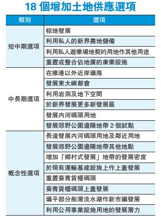 自昨日起,土地供應專責小組就18個土地供應選項展開公眾諮詢,長達76頁的諮詢文件封面以藍色為主色,主題為「增辟土地,你我抉擇」。文件提出了18個土地供應選項,包括4個短中期選項、6個中長期選項及8個概念性選項。在為期5個月的諮詢期內,小組將會舉辦大型公眾論壇、區議會工作坊、18區巡回展覽、社區探訪等。