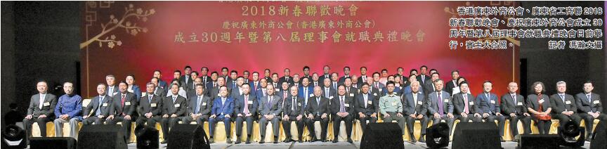 【香港商報网訊】記者霄虹報道:香港廣東外商公會、廣東省工商聯(總商會)2018新春聯歡晚會、慶祝廣東外商公會成立30周年暨第八屆理事會就職典禮晚會,日前在香港會展中心大會堂隆重舉行,戴德豐連任主席、許智銘連任會長。全國政協副主席董建華,署理行政長官張建宗,中聯辦副主任何靖,廣東省政協原副主席、孫中山基金會理事長湯炳權,外交部駐港副特派員趙建凱,駐港部隊副政治委員、少將陳亞丁等擔任主禮嘉賓,與兩會首長,來自內地、香港及澳門的政商名流、友好600餘人聚首一堂,共同見證新屆理事會就職,場面盛大。
