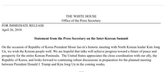 法新社4月27日报道称,白宫在北京时间27日上午9时发出声明,祝愿会晤顺利,“我们希望会谈能够朝着整个朝鲜半岛的和平与繁荣的未来进行。美国感谢盟友韩国与我们的密切协调,并期待着继续进行强有力的讨论,以准备在未来几周计划的特朗普总统和金正恩的会面。”