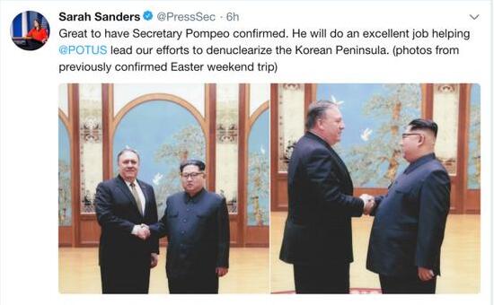 蓬佩奥提名通过,白宫发言人发放他早前与金正恩的合照。