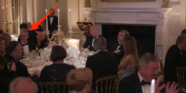 特朗普总统与库克会面前,他曾举行国宴招待法国总统马克龙。白宫发布的视频显示,库克与特朗普和马克龙同桌,且与特朗普仅一座之隔。