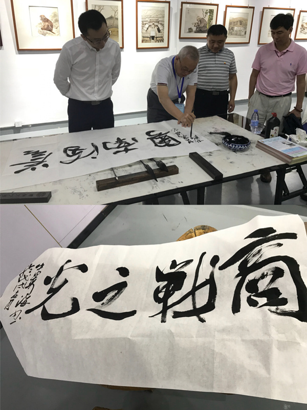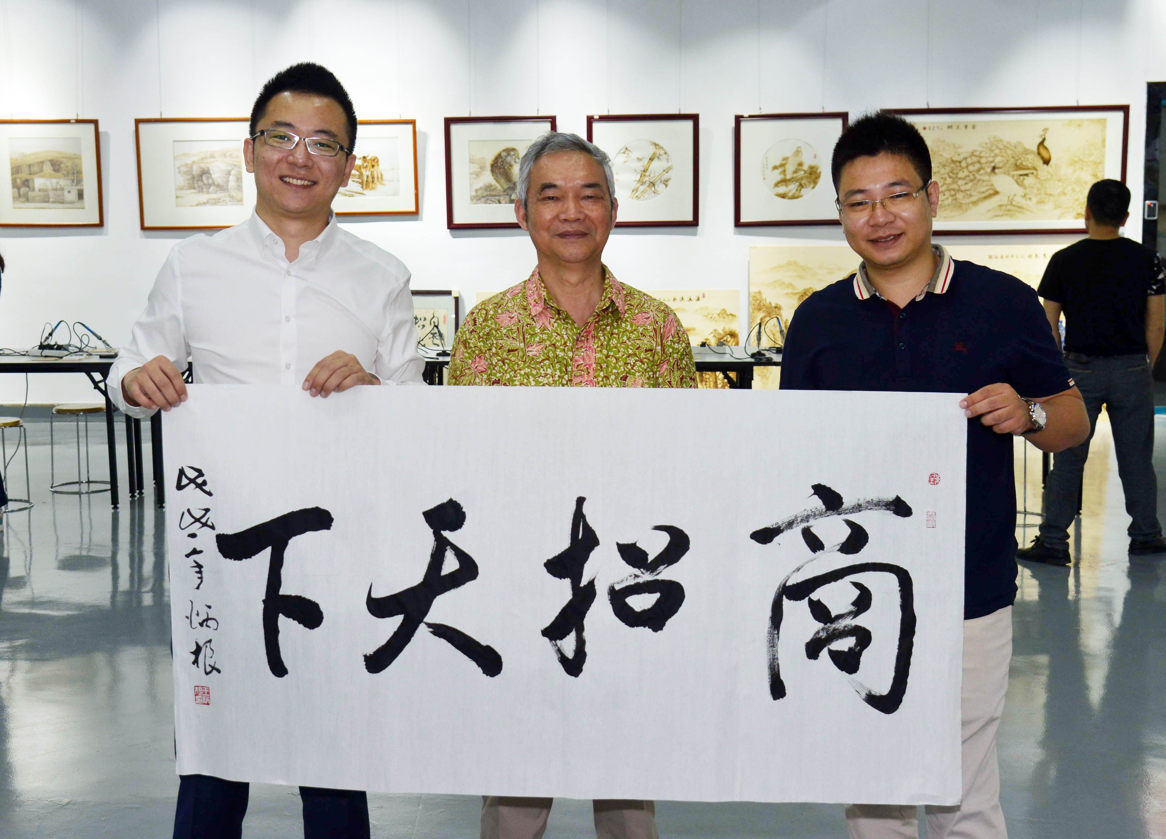 最后,齐子元陪同作家们来到位于产业园区内的烙画基地,这里也是深圳烙画艺术协会所在地。山西省作家协会副主席王祥夫站在一幅庭院里的画前表示,确实不错,协调、匀称、布局好,画作接近石板油画,用了不少油画手法,他为基地题字,“魅在铁笔”和“道存铁木间”。作家王炳根题写了”商招天下“;水运宪题写了”勇为潮先“。作家朱秀海则为招商局智慧城题写下了“商战之光”,“誉满南粤”,“智慧之城”。