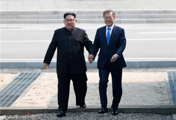 文在寅當天上午9時01分許抵達板門店,在韓方一側的「和平之家」稍作休息后,前往軍事分界線(「三八線」)迎接金正恩。9時30分許,金正恩與文在寅攜手越過軍事分界線,朝韓領導人在軍事分界線會面尚屬首次。