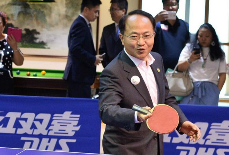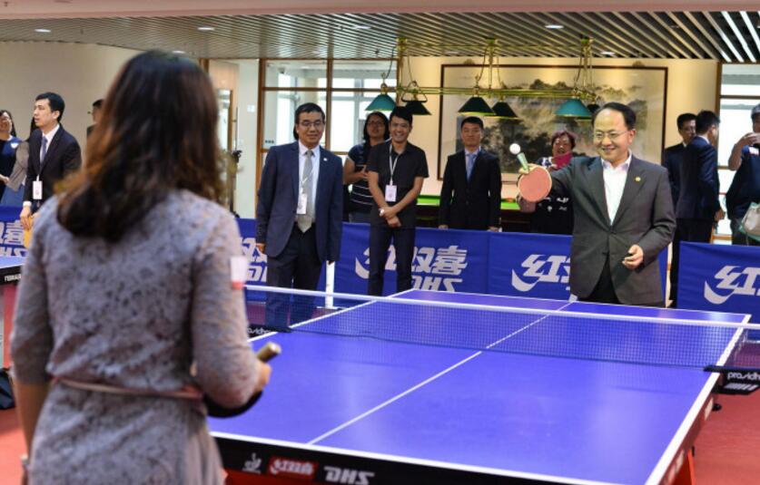 王志民与参观市民一起打乒乓球。