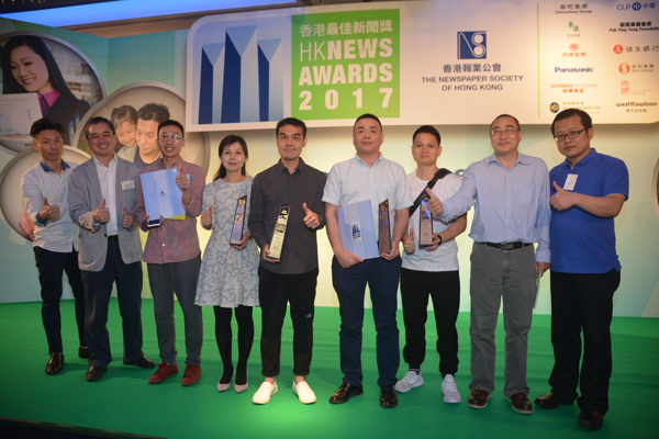 本報同事領取最佳新聞獎項後合照,中為最佳圖片(體育組)冠軍陳志誠,左三及四為最佳新聞報道亞軍得主朱輝豪、李穎,右四為最佳新聞版面設計(系列組)季軍張俊奇,右三為最佳標題(中文組)季軍鍾智維。