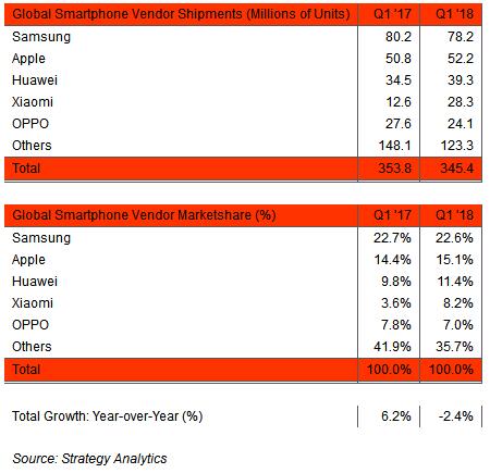 5月2日消息,近日国外调研机构Strategy Analytics发布了全球智能手机出货量报告,报告数据显示,2018年Q1季度智能手机出货量共3.45亿部,三星以23%的份额重回榜首。