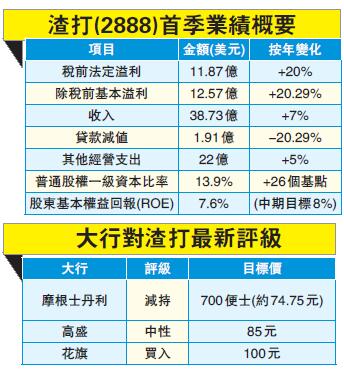 然而,對於渣打首季業績,業界看法不一。摩根士丹利發表研究報告預期,與首季相比,渣打第二季收入表現將更艱巨,因為融資環境更嚴峻及市場活動放緩。該行預計,渣打收入雖會逐漸上升但勢頭疲弱,加上集團控制成本,料收入增長與支出增長差須持續提升,才可令股本回報接近8%水平,因此該行給予「減持」評級,目標價700便士,約74.75港元。