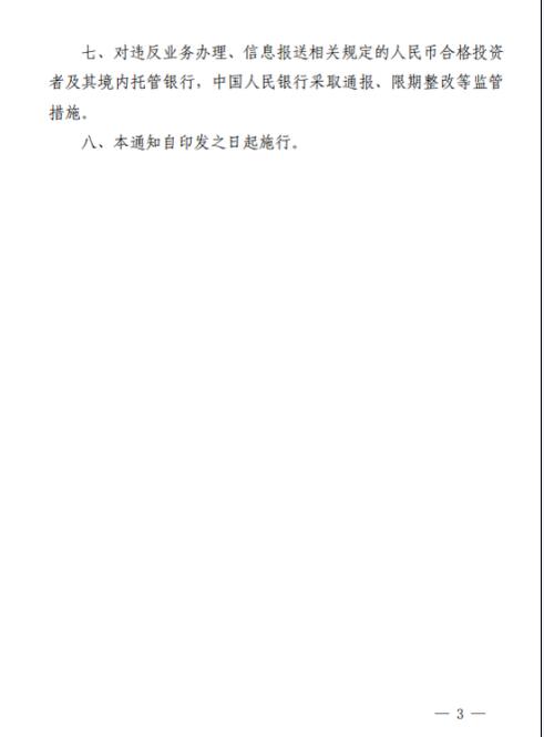 七、对违反业务办理、信息报送相关规定的人民币合格投资者及其境内托管银行,中国人民银行采取通报、限期整改等监管措施。
