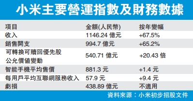 至於財務數據方面,小米初步招股文件披露,雖然公司2017年總收入1146.24億元(人民幣,下同),但受累期內錄得可轉換可贖回優先股公允值虧損擴大20.43倍至540.71億元,致其去年由盈轉虧,錄得438.89億元虧損,而2016年則錄得4.91億元盈利。分部業務方面,比例最高為智能手機,占比70.3%,該部分收入按年升65.21%;物聯網(IoT)及生活產品收入為234.47億元,占20.5%;互聯網收入98.96億元,占8.6%。