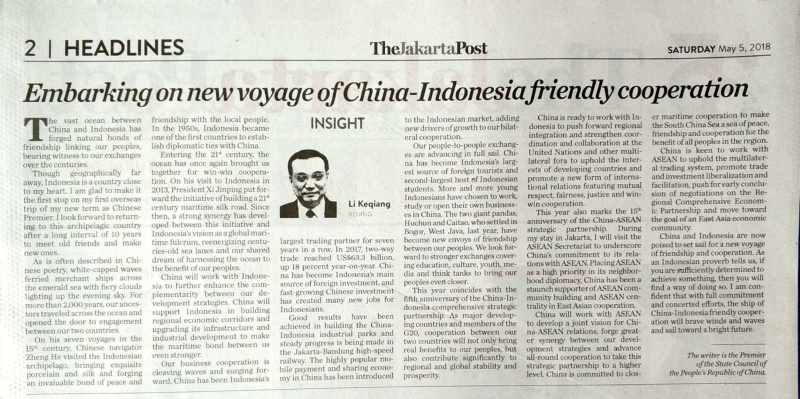 此外,李克強5日在印尼最具影響力的印尼文報紙《羅盤報》和英文報紙《雅加達郵報》發表署名文章《開啟中印尼友好合作的新航程》。