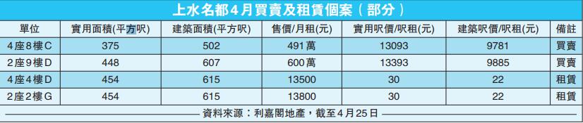 利嘉閣上水中心一行首席聯席董事黃靜顏透露,「上水名都」以用家主導,吸引不少上車及換樓人士,入場容易,受到新婚夫婦的歡迎。不過,屋苑放盤向來不多,因此議價空間有限。成交方面,本月暫錄2宗交易;租務方面,截至目前同樣只有2宗租賃。對於樓價走勢,黃靜顏表示,對比12個月以前,當時同類型的單位叫價只有450萬元,預計年底會再升5%至6%。租金方面,12個月之前的呎租為26元,現時為30元,業主的租金回報率約3.56%。