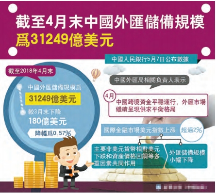 【香港商報网訊】記者伍敬斌、實習記者何文鑫報道:中國人民銀行周一發布數據顯示,4月中國外匯儲備規模為31248.52億美元,環比減少179.68億美元。這是過去15個月中,中國外儲第二次出現月度下滑。這一結果並不讓人意外,在此之前已有許多分析認為4月外儲將會有所下跌,原因是美元升值和美債價格下跌。不過,另有專家認為,中國創匯能力有所下降,才是外儲下降的主要原因,美元和美債的因素影響有限。從2017年開始人民幣匯率由降轉升,到今天這個位置,已讓外貿企業受壓嚴重,外貿企業訂單利潤降低,是影響中國國際收支最重要的原因。