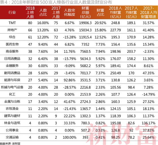 到了2018年,TMT行业进一步扩大创富优势,不仅TOP2富人均产自TMT行业,人数占比也高达榜单1/6,财富占比1/5。
