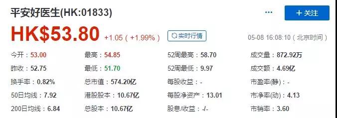 昨天一开盘,平安好医生的股价就一路下挫,收盘时,已经跌至52.7港元/股,比当天的开盘价、也是其发行价54.8港元跌3.74%。而今天,平安好医生也没能涨回发行价,截至收盘,平安好医生的股价为53.8港元/股。