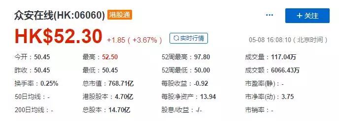 在上市当日,众安从59.7港元的发行价一路飙升,10天左右更是暴涨至97.8港元。