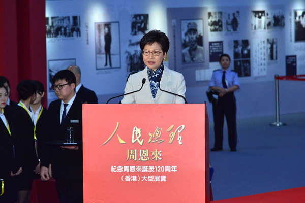 林鄭月娥致辭時表示,作為中華人民共和國的開國元勳,周恩來總理擔任總理長達26年,對國家建設作出巨大貢獻;他勤政愛民、清正廉潔的形象深入民心,深受人民愛戴敬重,因此有「人民總理」的美譽,是中國人民心目中溫暖的、自豪的領袖。