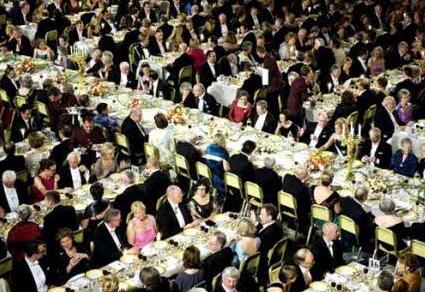 奧斯卡有晚宴,諾貝爾也有自己的宴會。諾貝爾獎晚宴最出名的不是從意大利空運到瑞典,穿越歐洲的鮮花,不是瑞典頂級美食,也不是瑞典國王或女王,而是人多。不大的空間放了上千人,只有胳膊挨著胳膊才能保證所有人都能坐下吃飯。人潮擁擠我能感覺你~~