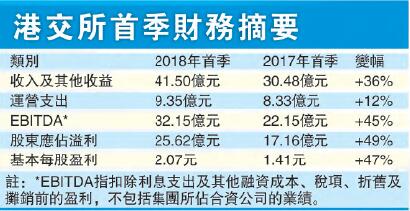 【香港商報网訊】記者潘晶、邱媛媛報道:港交所(388)昨日公布2018年首季業績:截至3月31日,股東應占溢利25.62億元,按年增長49%,創歷來新高;EBITDA按年大增45%至32.15億元;每股基本盈利2.07元,較去年同期1.41元大增47%,未有派息。