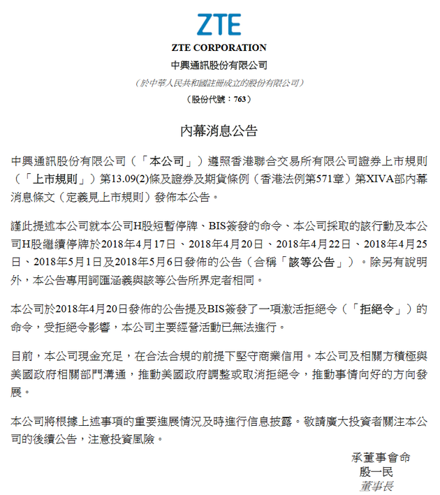 中兴通讯在公告中表示,公司于2018年4月20日发布的公告提及BIS签发了一项激活拒绝令的命令,受拒绝令影响,本公司主要经营活动已无法进行。