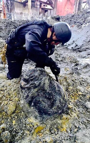 警方爆炸品處理課高級炸彈處理主任周錫健在視察該枚出土炸彈后稱,它與本年1月底兩次發現的一樣,都是美式空投炸彈,重達1000磅,炸彈威力差不多,但與上兩次情况不同,今次發現的炸彈是「直插式」,只看到尾部,引爆管已裂開,需要花多些時間挖掘泥土,才能看到其他部分有無損壞。由於落雨令泥土松脫,若處理時爆炸,碎片會飛至800米外,氣流及冲擊力可達100米,經已擺放沙包及水包減低殺傷力,難以估計要花多久處理時,可能會比前兩次更久,周續指目前有12名同事處理該炸彈。
