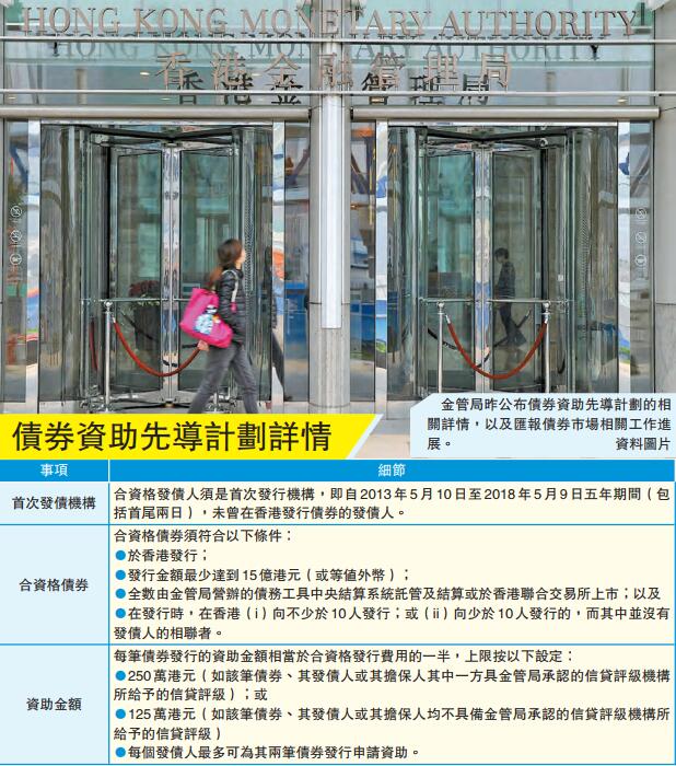 【香港商報网訊】實習記者仝薇報道:金管局昨日公布債券資助先導計劃詳情,向首次來港發債的合資格發債人提供資助,每次資助額高達250萬元。金管局指,期望一系列有利措施有助提升香港在亞洲債券市場的市佔率。
